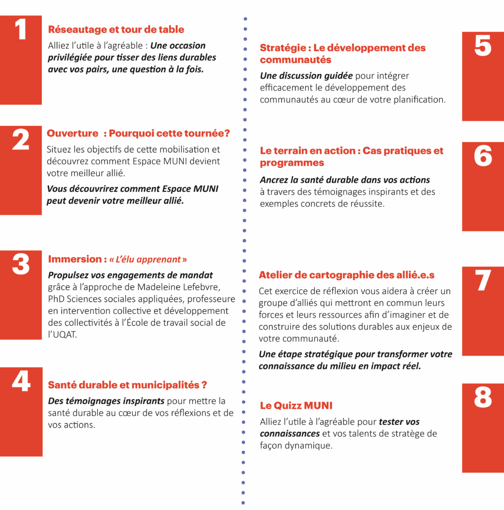 Une formule dynamique qui combine ateliers, présentations et réseautage. Ces échanges permettront de réfléchir collectivement au rôle stratégique des municipalités pour les prochaines années et de renforcer la capacité d’action des élues et élus au sein de leur communauté.