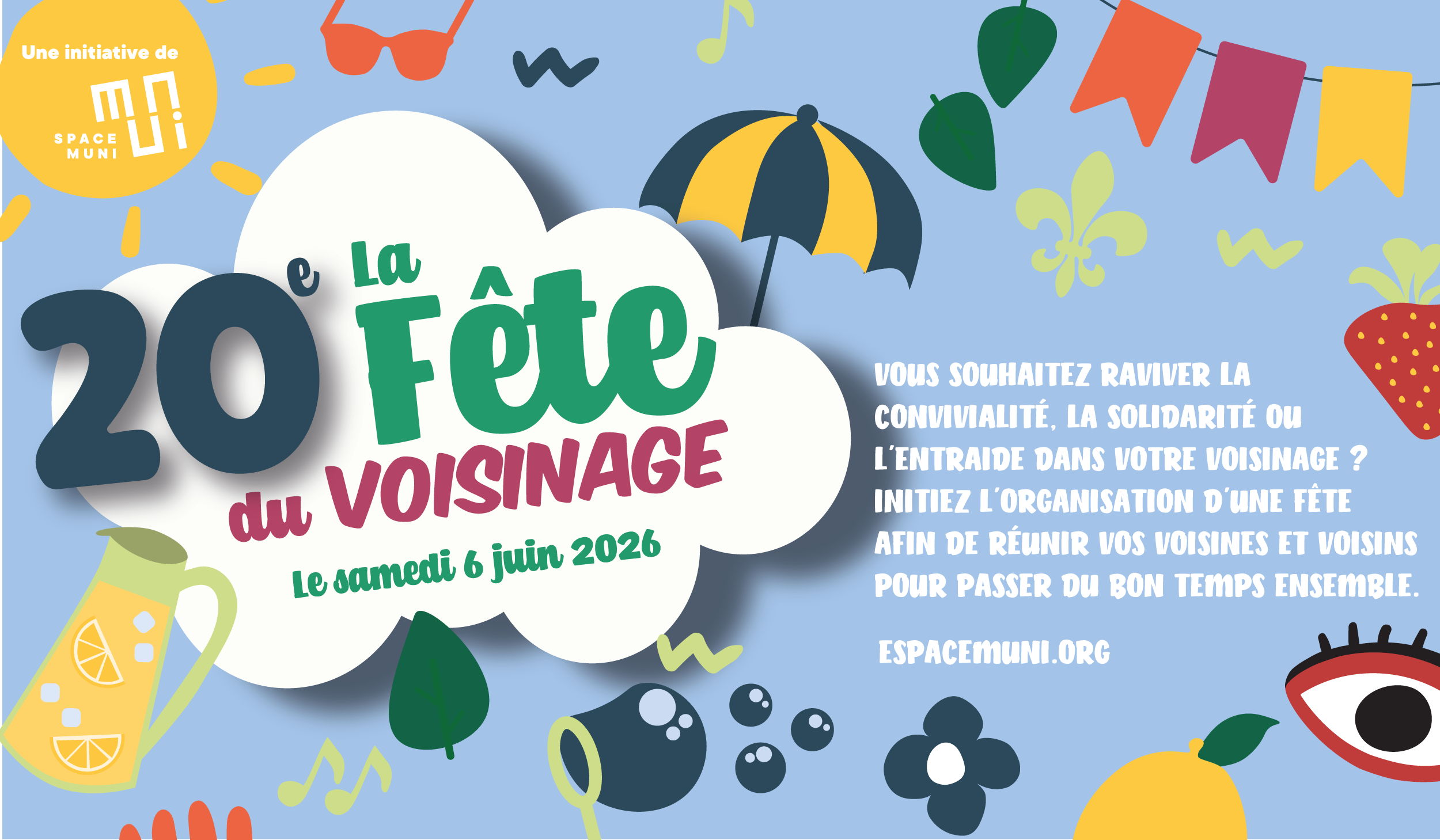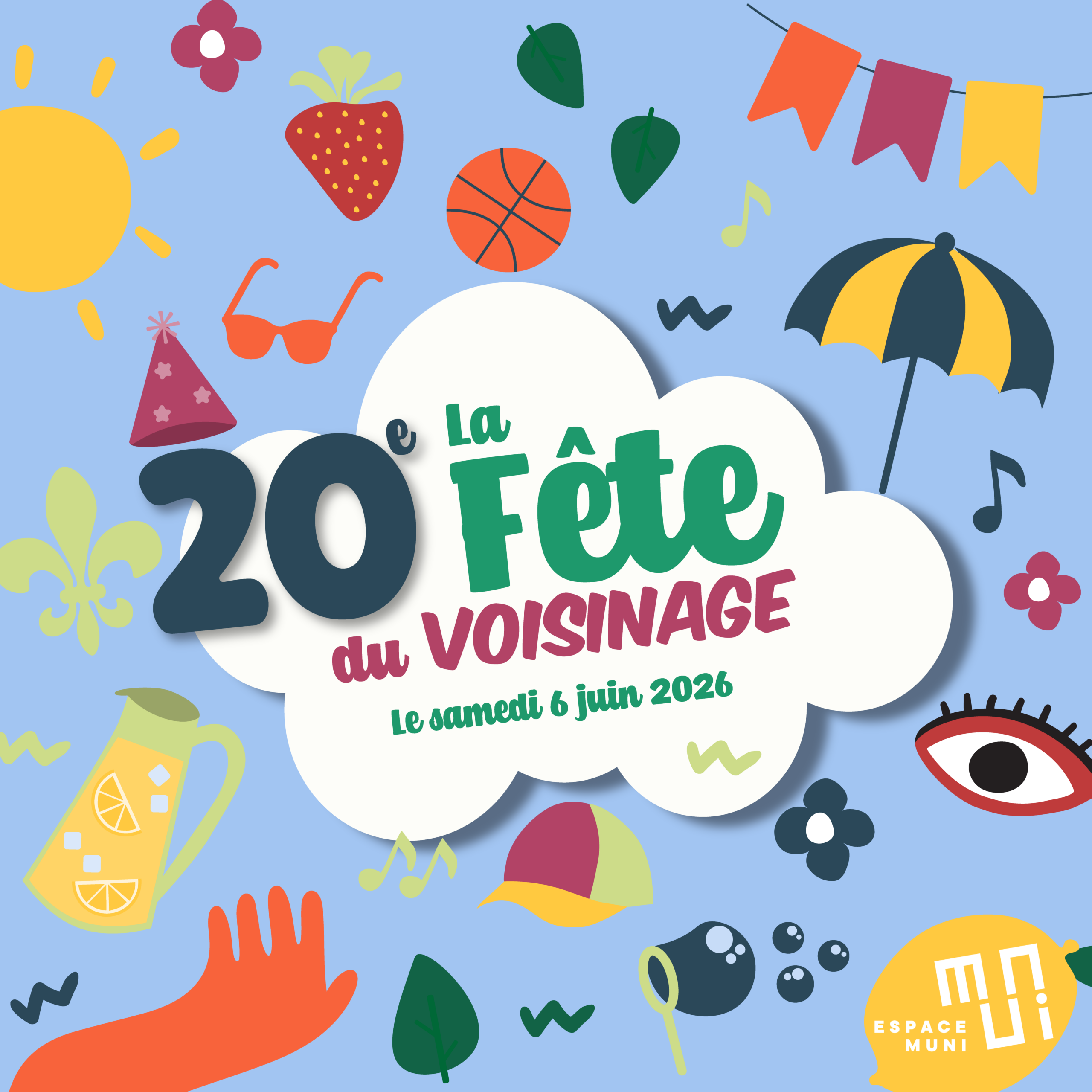 Sur cette page, vous trouverez des outils promotionnels de la 20e édition de la Fête du voisinage. Nous vous invitons à télécharger les éléments qui vous inspirent afin de faire rayonner votre fête et rassembler votre voisinage dans un esprit convivial et festif.